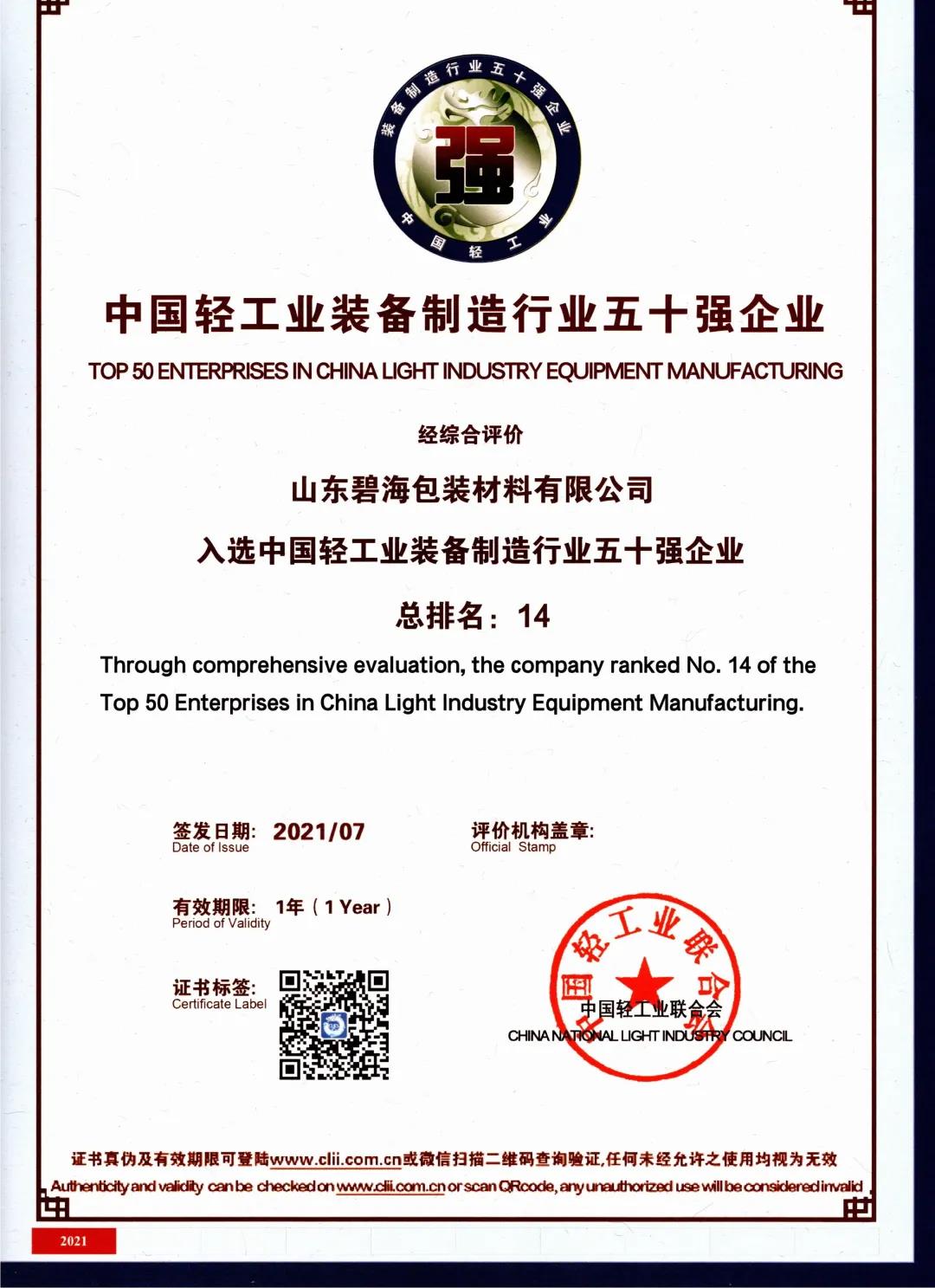 2021年7月20日,在北京召開的“奮進‘十四五’領(lǐng)航新消費”中國輕工業(yè)百強企業(yè)高峰論壇上,碧海公司入選中國輕工業(yè)裝備制造行業(yè)五十強企業(yè)(排名14)、中國液態(tài)食品機械行業(yè)十強企業(yè)(排名4),這是對我公司綜合實力、創(chuàng)新成就的高度肯定和認可。