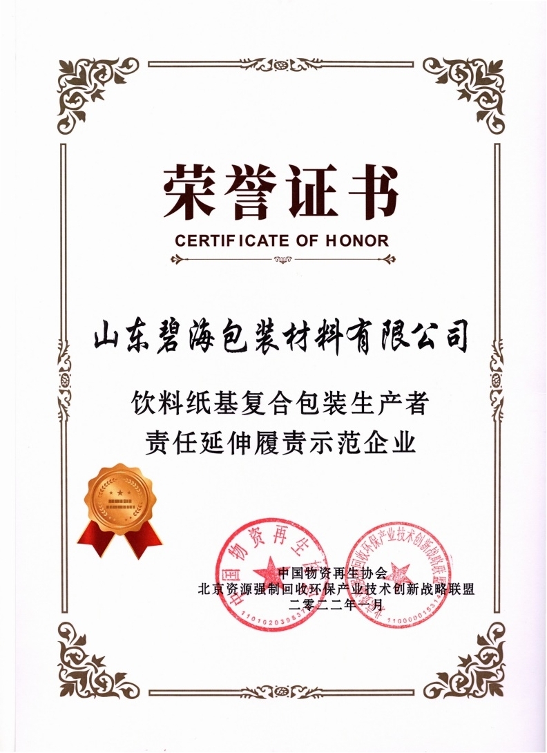 2022年1月12日,中國飲料紙基復合包裝可持續(xù)發(fā)展協(xié)作體2021年度會議在北京召開。會議對碧海公司在2021年推行環(huán)境友好包裝設計、開發(fā)可再生原料包裝、共建飲料紙基復合包裝回收協(xié)作體、規(guī)范回收利用等方面的工作給予了肯定,授予“飲料紙基復合包裝生產(chǎn)者責任延伸履責示范企業(yè)”榮譽稱號。
